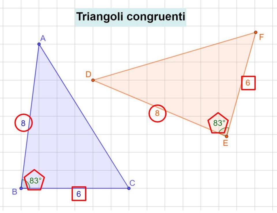 I due triangoli hanno i lati AB e DE uguali, infatti hanno la stessa lunghezza, cioè 8.